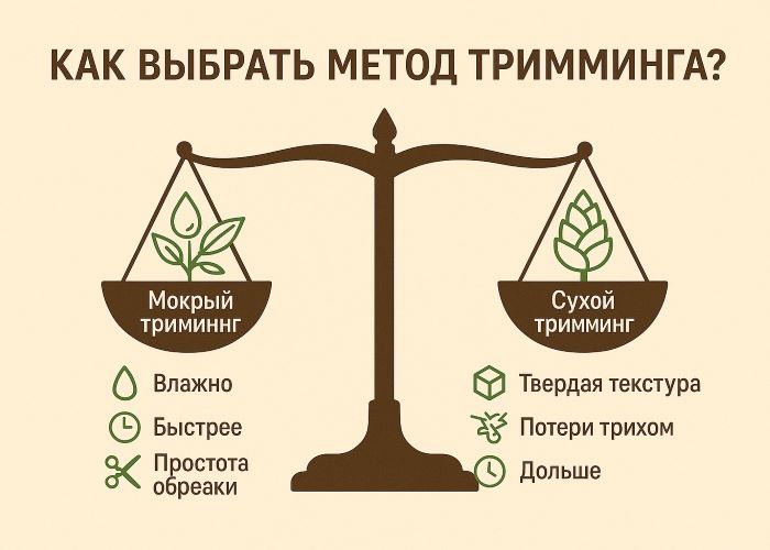 Выбор между мокрым и сухим триммингом зависит от нескольких ключевых факторов, включая климат, цели выращивания и способы хранения конечного продукта.
